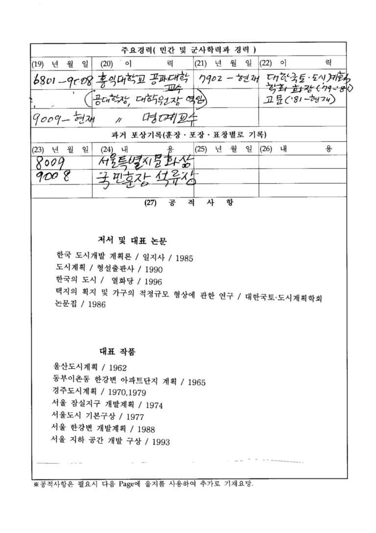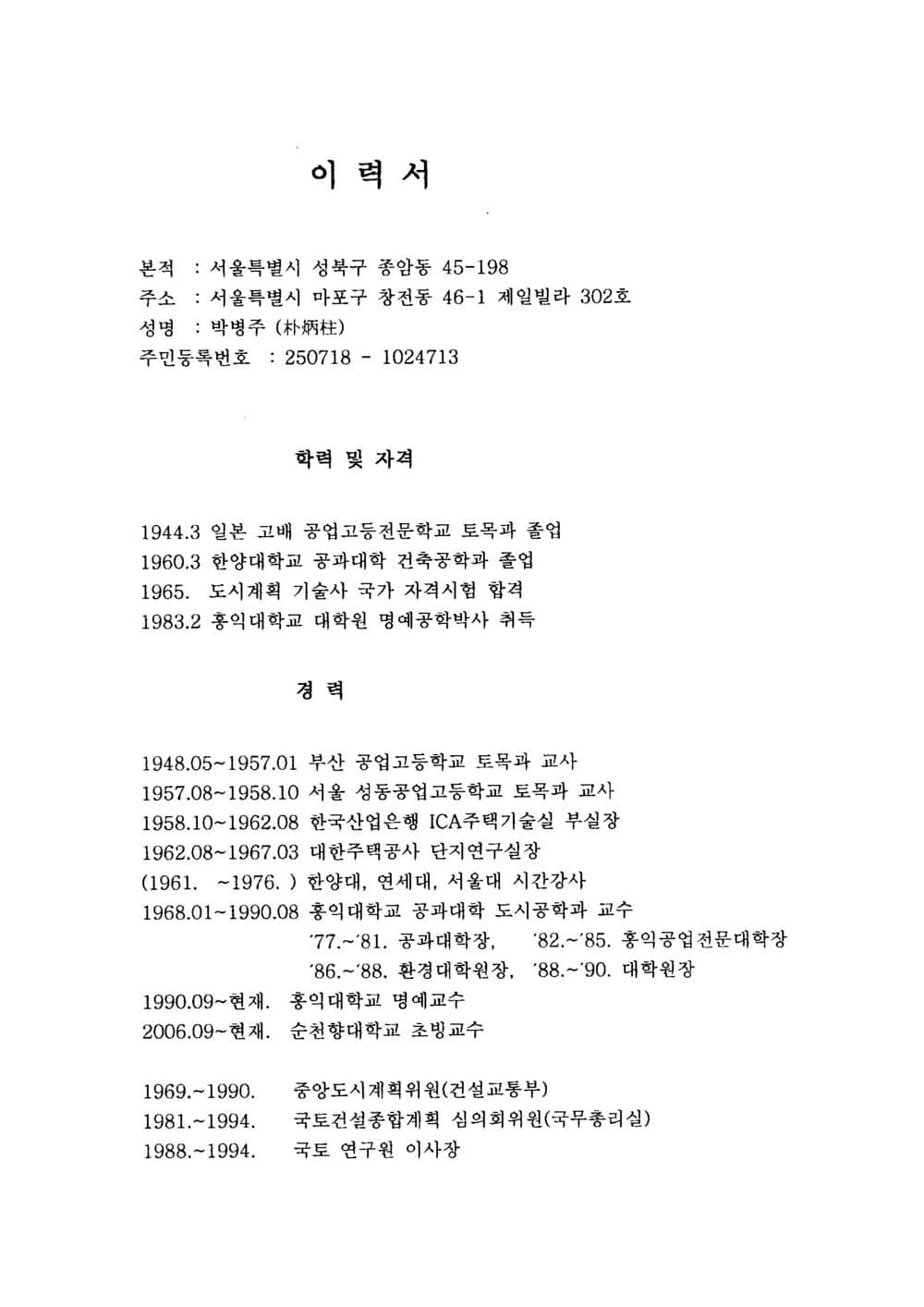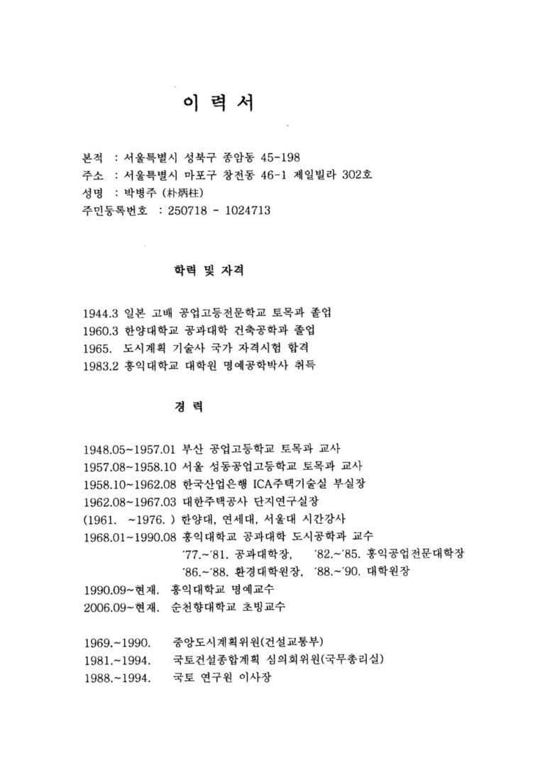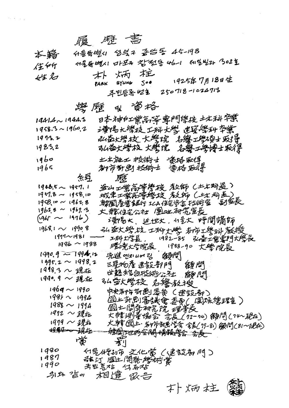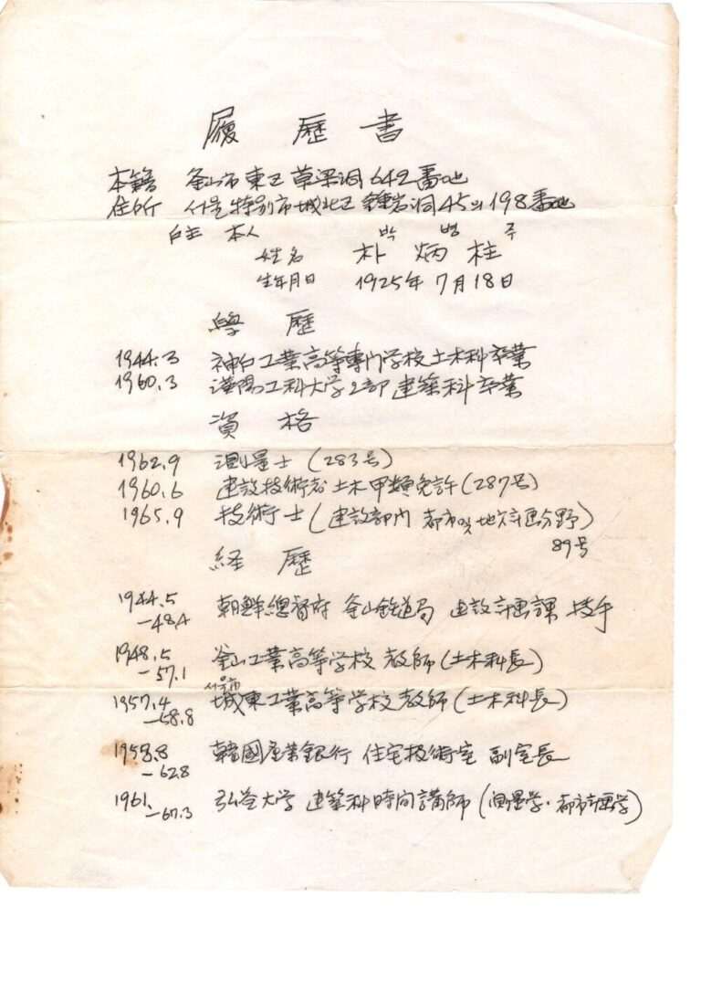 학산의 자필 이력서
